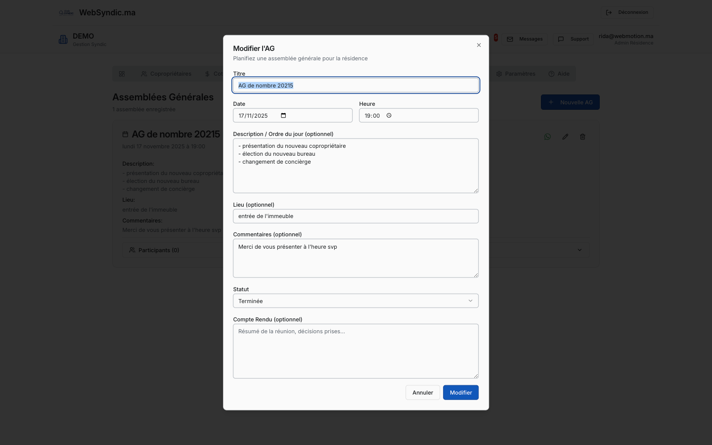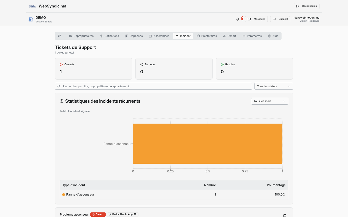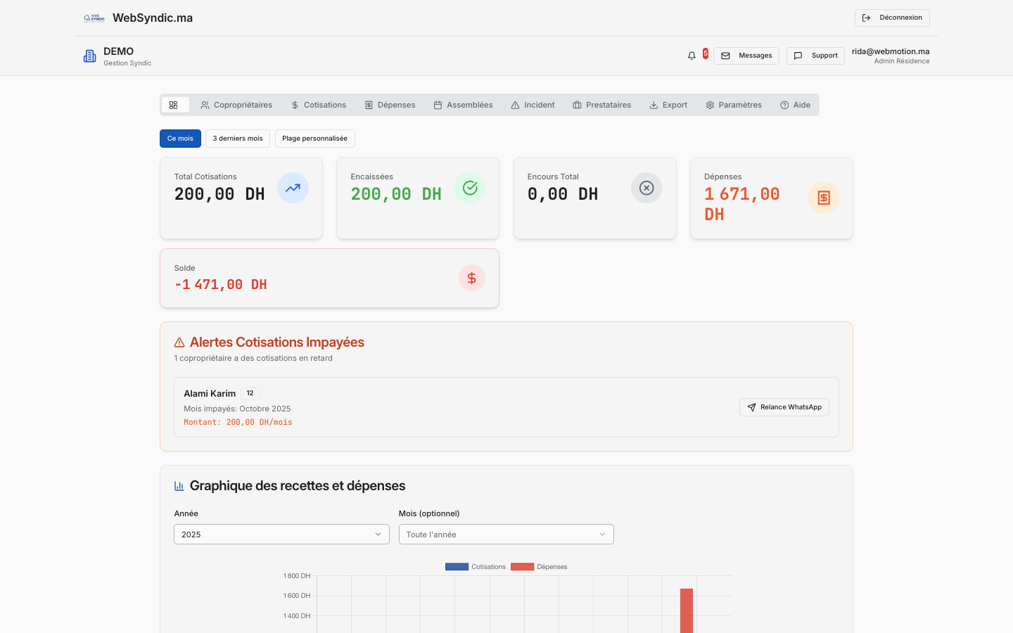 WebSyndic.ma est une application web qui permet de gérer facilement la vie d’une résidence : cotisations, dépenses, assemblées générales, incidents, prestataires et rapports.Chaque résident dispose d’un accès sécurisé pour suivre la gestion en toute transparence.