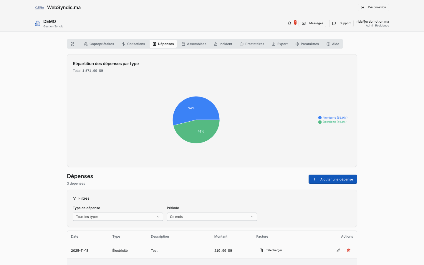 💡 Exemple : Analysez les charges par catégorie (entretien, énergie, réparations...) et exportez vos rapports.