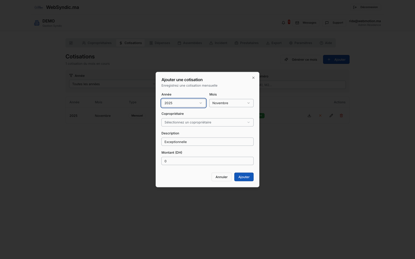 💡 Exemple : Créez une cotisation mensuelle pour chaque copropriétaire/locataire et validez les règlements dès réception.